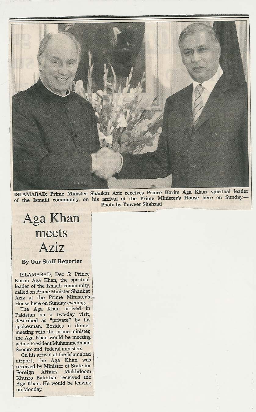 | News Article | PRIME MINISTER SHAUKAT AZIZ ASKS HIS HIGHNESS THE AGA KHAN TO INVEST IN PAKISTAN - 2004-12-06 | Spiritual Leader of the Ismailis, Prince Karim Aha Khan called on Prime Minister Shaukat Aziz here at the Prime Minister House on Sunday and discussed the regional and international situation.He congratulated the Prime Minister on his successful tour of SAARC countries. |