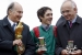 Belgian jockey Christophe Soumillon poses with his trainer Alain de Royer Dupre (R) and the Aga Khan (L), owner of French horse Zarkava, after capturing the 87th Arc de Triomphe horsing race, the world's richest race on turf, at Longchamp Racecourse near Paris October 5, 2008.